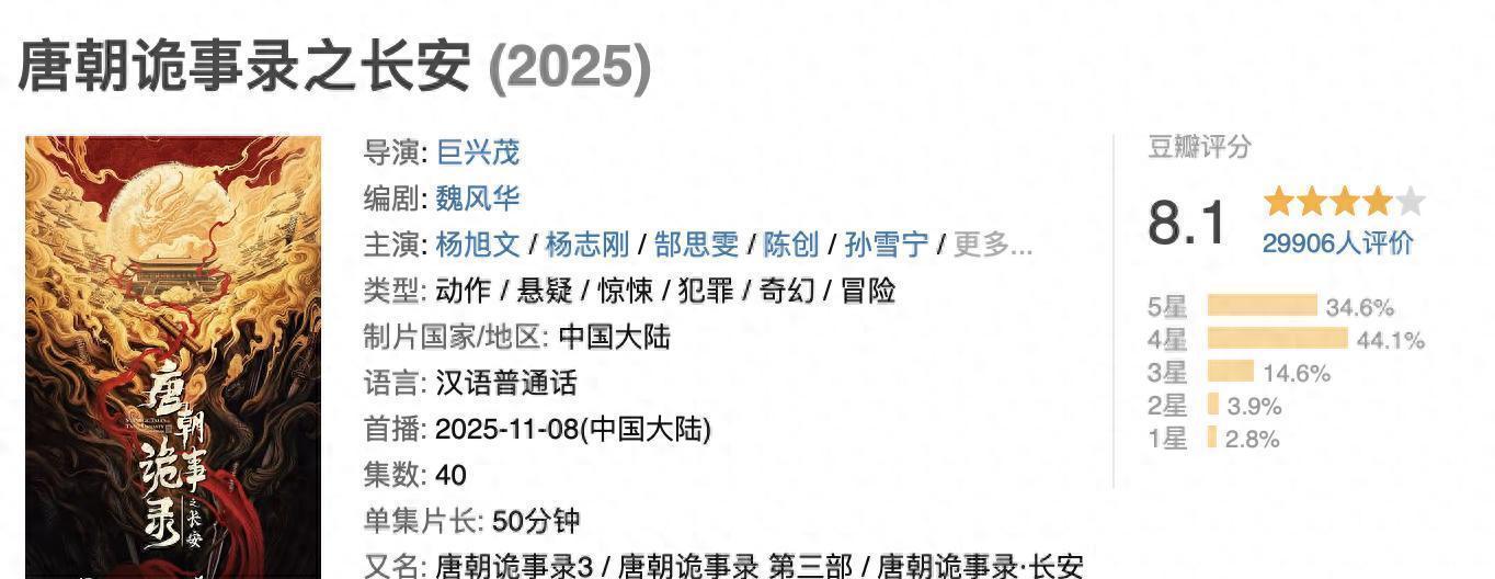 《唐朝诡事录 3》刚播 5 天就爆了!豆瓣 8.1 分、站内热度破万,话题刷个不停,近期国产剧里实属能打。 剧情紧凑不拖沓,悬疑感拉满,演员表现也在线。苏无名分析案情头头是道,卢凌风打戏干脆利落,看得人上头得很。更惊喜的是实力派配角,《成佛寺的哭声》里赤英大娘的扮演者杨昆老师,你们认出来没?